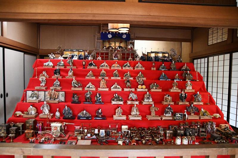 おひなさまの展示は、一階に、庄内の名家・風間家に伝来したひな壇と、林昌寺から寄贈されたおひなさまがあり、2階には、豪商・白崎家に伝来したひな壇飾り(横幅3.6メートル、8段)が飾られていました。 |
