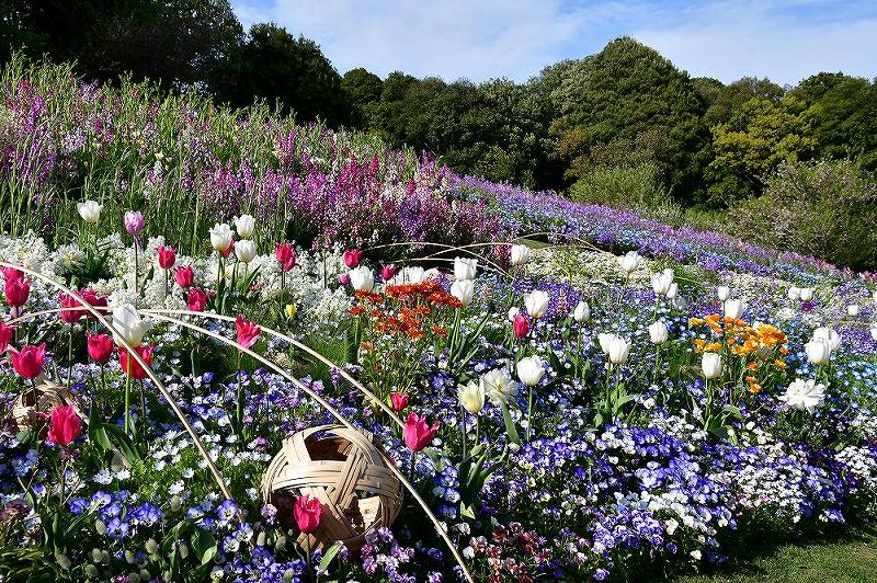 とくに、秋の里山ガーデンに比べて、全体的に明るい色の花が多いために、よりいっそう、うきうきした気持ちになれました。横浜市内最大級10,000uの大花壇で、ネモフィラやパンジー、チューリップ、ラナンキュラス、ルピナスなど約110