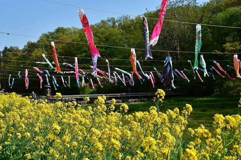 そして、恒例となった「鯉のぼり」が菜の花と八重咲きの桜とコラボしていました。 |