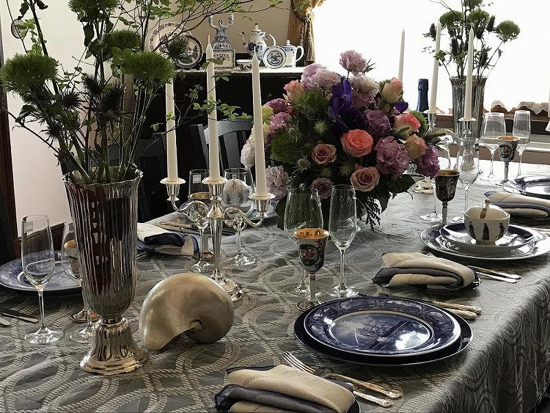 2階のダイニングでは、江戸後期に長崎に誕生した高級陶磁器メーカー「香蘭社」や、1882年創業の横浜元町の「タカラダ」の食器を用い、イギリス式のテーブルセッティングには、船内のような丸窓があるお部屋では、船の中をイメージしたビュッフェが並んでいました。