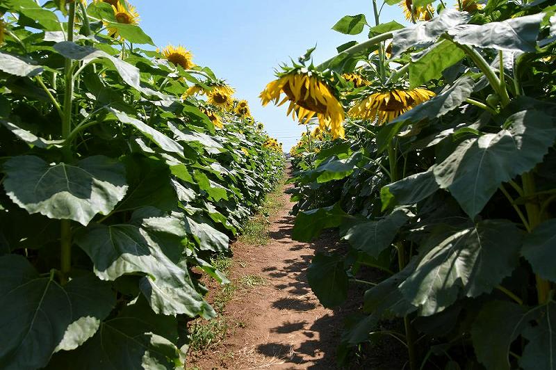 見ごろの時期に来たのだが、連日の猛暑のせいか、大きく成長したひまわりは、首を曲げておじぎをしていました。