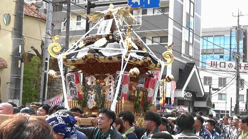 北条政子行列の過ぎ去った歩行者天国では、市内を練り歩くお神輿や、7年に一度の「御柱曳きの名物の担ぎ箱」協賛していました。
