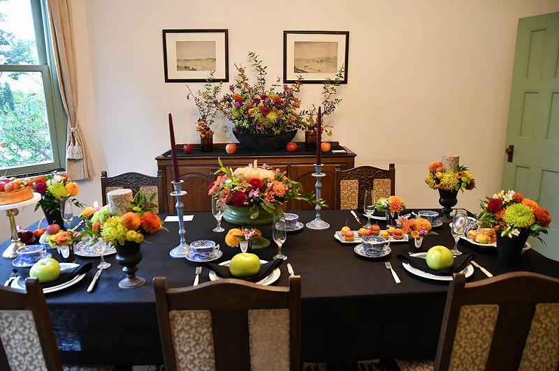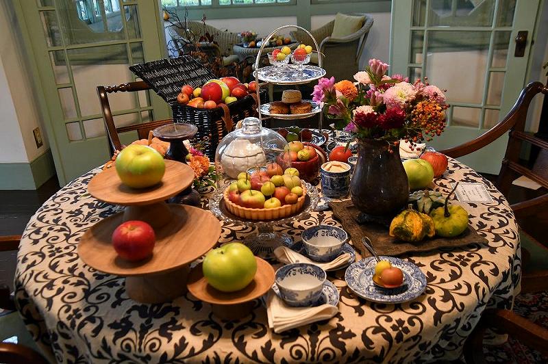 ダイニングルームやサロンやリビングのテーブルには、緑のリンゴや赤いリンゴの甘い香りが漂っており、マムの花が部屋を彩どっていました。