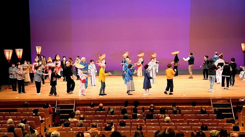 最後の輪踊りの後は、出演者全てがロビーで、来場者と交流を深めていました。 |