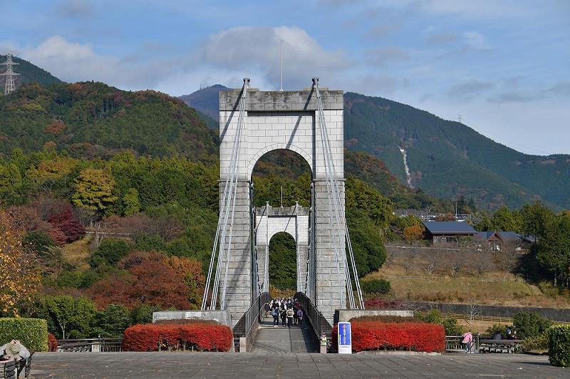 一昨年は12月7日に来ているが、今年はいつまでも暑い日が続き、紅葉は危ぶまれたが、急に寒くなったので、暦どおり、紅葉の見ごろの時期になった。 ここの景色(風の吊り橋)は、赤・オレンジ・黄色・黄緑とカラフルな木々に染まって吊り橋も「主役になった」感じである。