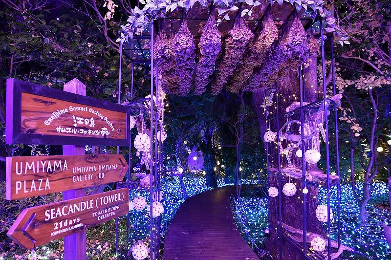 唯一無二の美景は「関東三大イルミネーション」や「日本夜景遺産」など、数多くの栄誉を獲得している。見所は、江の島サムエル・コッキング苑のエントランスでは、遠近感を一気に失うまるで満天の星空を彷彿とさせる圧倒的な量の宝石イルミの世界が広がります。
