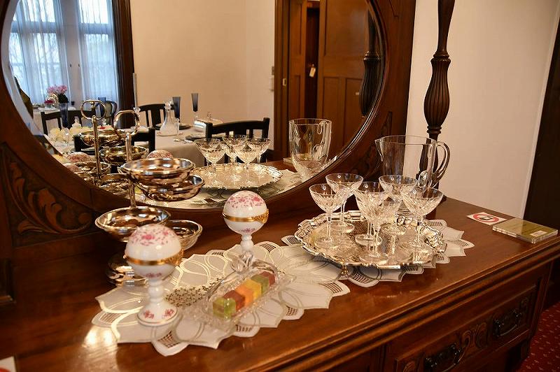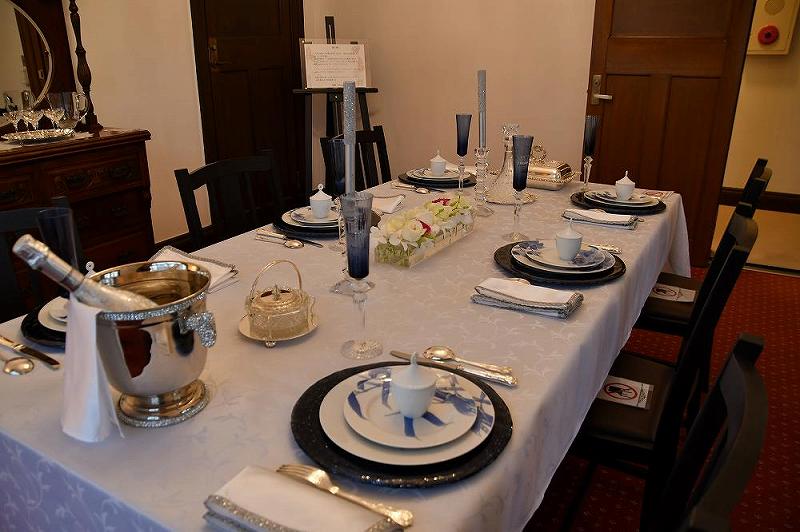 「英国の銀器」と「有田焼の洋皿」で仕立てた晩餐の食卓を中心に、 英国と日本の美しい文化を合わせた「エクレクティックスタイル(折衷様式)」の空間装飾です。 有田焼の洋皿は、2025年11月に黄綬褒章を受章された有田焼伝統工芸士・塚本増夫氏による染付作品です。
