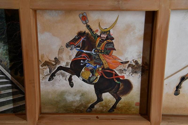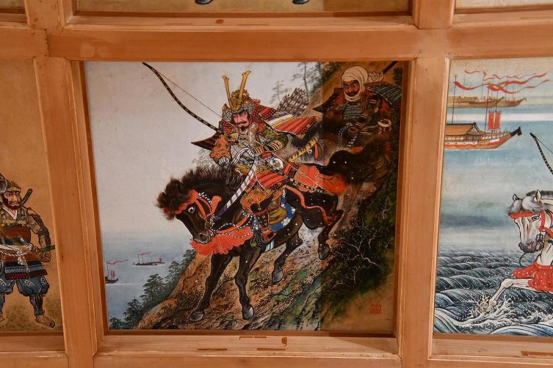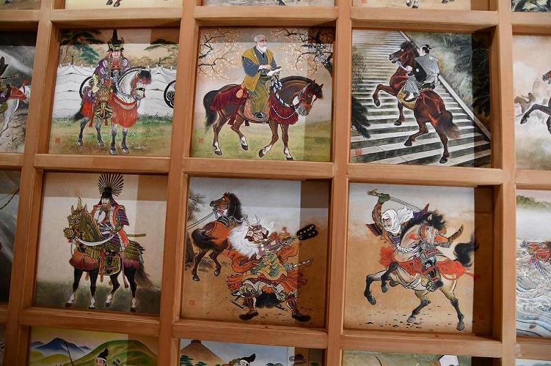 拝殿の格天井には、神武天皇の御世から昭和に至るまでの日本馬乗史を描いたもので、100枚の絵が奉納されて、馬にまつわる歴史が一目瞭然に理解できます。