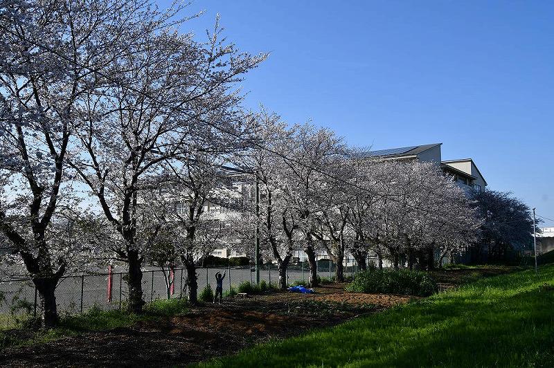 橋を渡ると、厚木市立相川小学校の校庭のサクラ並木が満開でした。