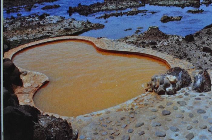 写真をご覧の通り、雨除けも無ければ風よけも無い吹きっさらしの温泉で、大しけの時には、海水が湯船の中に流れ込む事が有る。