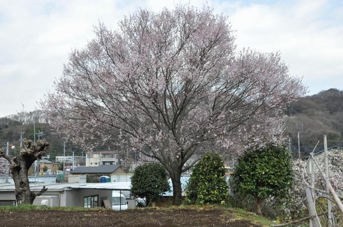 厚木市小野地区の小野橋付近を走行中、樹形の良い、真っ白な球形の桜が目に止まった。