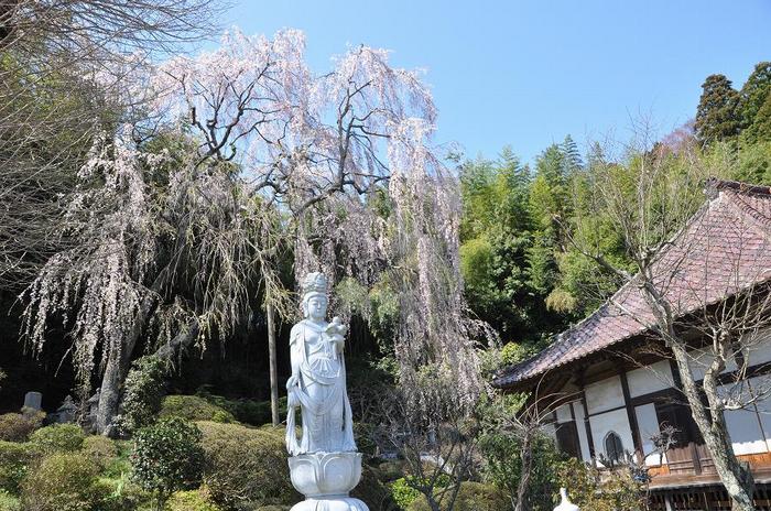本堂横の昔からの墓地には、シダレザクラの古木が有り、長い枝垂れた枝に桜の花がびっしりと付いている。