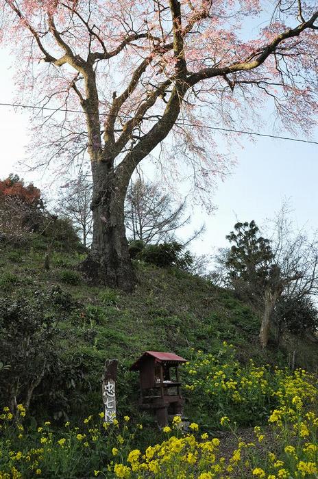 | ところで、このシダレザクラには秘めたエピソードがある。 ---------------------------------- 戊辰戦争の時に官軍の荷運びに懲役された宗像忠七翁が、会津の惨状を目の当たりにしたそうだ。 故郷に帰ってから、会津の人々の霊を慰めるため、自宅前に植えてあった桜の木を、谷戸の丘に移植したそうだ。 そして、この山を寿命山と名づけて丹精を込めて、永年、私設公園として整備したそうだ。 忠七翁は遺言として、子孫に、「桜と公園を守り、末代まで手入れを怠らぬよう」と言い遺したそうだ。 |