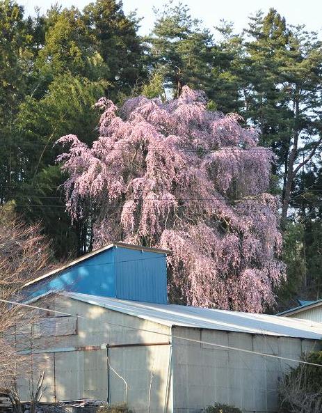 近くの電柱には、「黒木字宮ノ前」の文字、馬頭観音の桜から振り返ってみたら、見事なシダレザクラが見えた。