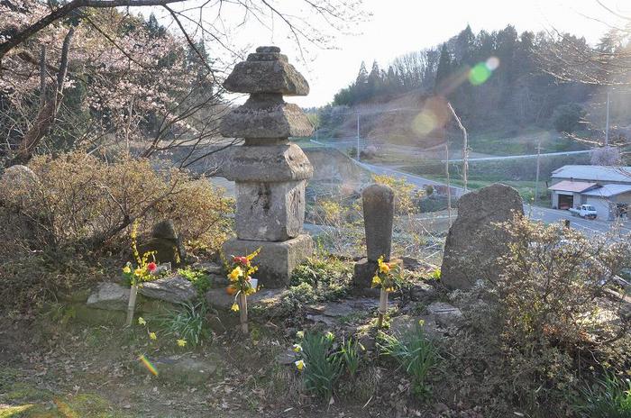 黒木の石造三層塔の桜