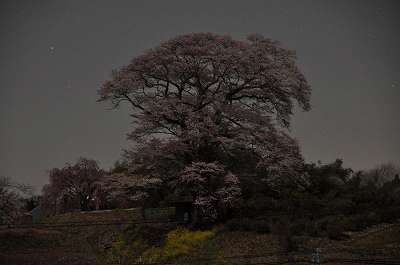 七草木桜を遠望から撮影しようと、70メートルほど遠ざかったら、別の方向に、闇夜の中にとてつもなく大きな物体が丘の上に見えた。