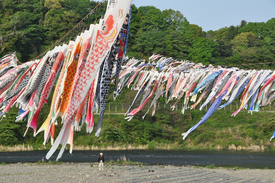 相模川の両岸に5本のワイヤーを渡し、約1,200匹の鯉のぼりを吊るし五月晴れの大空を泳ぐその姿は、実に雄大です。