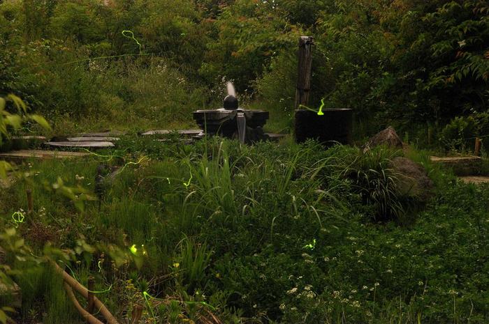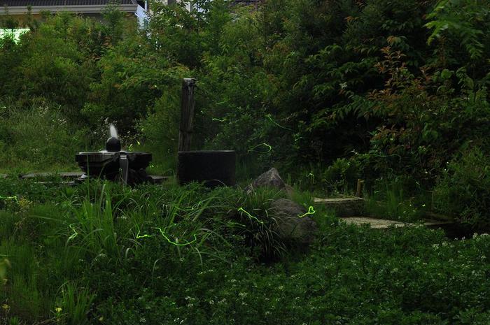 しかし、ホタルは飛んでくれている。 私はカメラの横で透明傘を差している