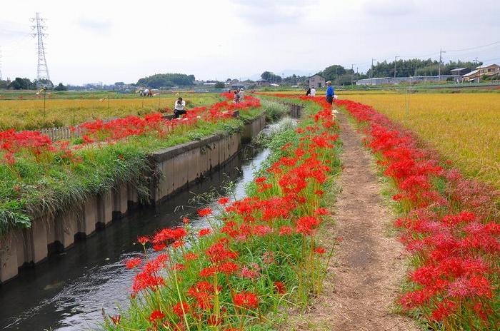 会場は藤沢市遠藤の大黒橋から茅ケ崎市芹沢と寒川町大蔵の境にある追出橋までの小出川両岸3キロにおよび、約80万株の彼岸花が咲く。