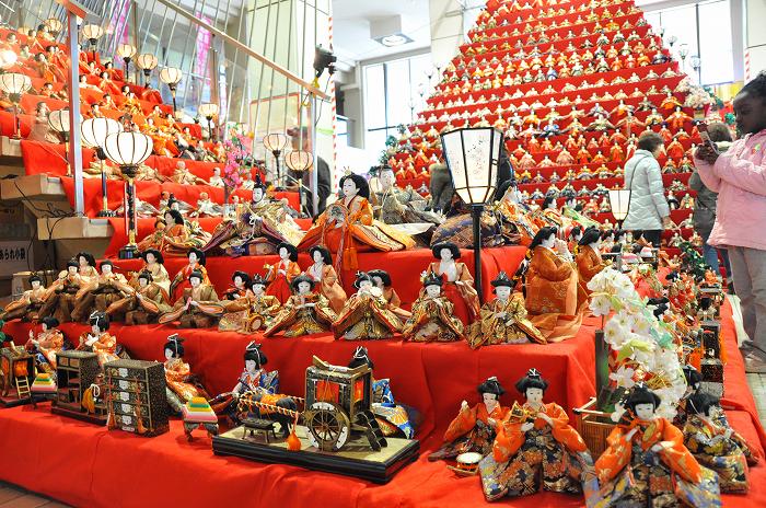 | JR鴻巣駅に隣接している「エルミこうのすショッピングモール」も吹き抜けの空間を利用して、第2会場として、五角錐型ひな壇が出来、上品なおひなさまが飾られている。 こちらの会場は商業設備だけあり都会から来た観光客を招き入れるには充分な会場であった。 第3会場は、市役所に隣接する「クレアこうのす(鴻巣文化センター)」の日当りの良い窓際に60メートルで3段の飾り付けがなされていた。 さぞかし、お雛さまも日焼けするのではと、(笑!) ・・・・・老婆心ながら心配しました。 江戸時代から380年の歴史を誇る『鴻巣びな』は、「関東三大雛市」の一つで、特に着物の着付けでは関東一という評判で、江戸の職人たちは競って鴻巣に修行に来たそうだ。 昨年取材した「ひな飾りをご覧出来ます」 ⇒ここをクリック |