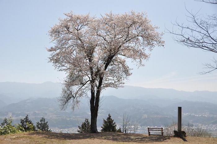 一本桜は、本丸跡の崖の縁にあって、遠くに南アルプスの山並みを、そして眼下には伊那谷ののどかな風景を眺めるすばらしいロケーションにひっそりと立っています。