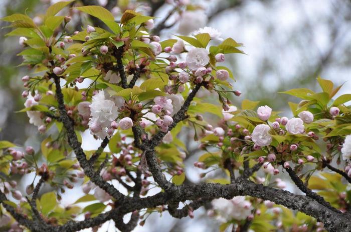 花は淡紅白色で、花弁数は30〜40枚ある。