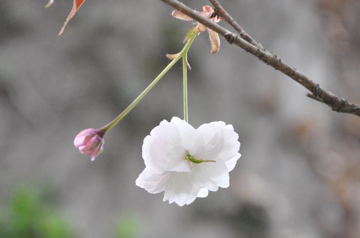 花は大輪、八重咲きで咲き始めは淡紅色で,満開になるとほぼ白色に変わります。