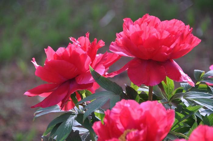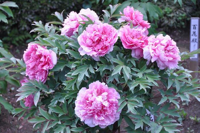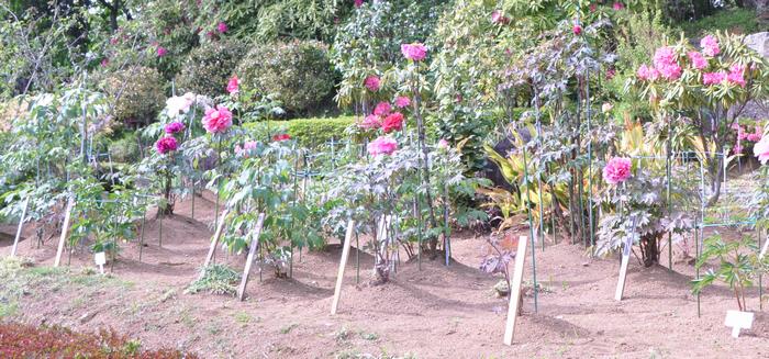 ボタンの根元が山になっている ・・・下の3枚目の写真を参考・・・ 植えつける時に、地表から15cmほど盛り上げてシャクヤクとの接ぎ口を5cmほど隠れるように植えつけている為。