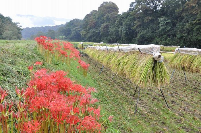 西丹沢の鍋割山を源流として、いずれは小田原の酒匂川に合流する四十八瀬川(なだらかな平野を流れる為、瀬が多く有ります。)は、上流の才戸橋から下流の甘柿橋周辺には、稲作を中心とする水田が有り、田んぼの畦道や河川の土手には「真っ赤な彼岸花」が咲いていました。