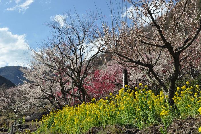 湯河原梅林の梅の樹は、紅梅・白梅・枝垂れ梅と約4000本有るのだが、早咲き、中咲き、遅咲きと順次、低地から高地へと咲き進む為、いつ行っても、満足出来なかったのであるが・・・・・、今年は一味違った。3月下旬の遅咲きの時期に、全ての梅の樹が一斉に満開になったのである。