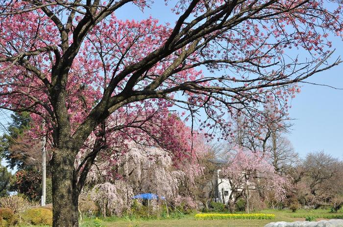 現在の城主の荻野家の土地には、秋には、400年物の禅寺丸柿の樹が空にそびえていたが、春には、一月遅れの梅の花が咲き、沖縄から取り寄せた「寒緋桜」の種から育てた桜の木が濃い紅色の花を開き、チューリップ、菜の花、スミレ、ヤマブキ、レンギョウ、ミツバツツジ、シャクナゲ、山桜、そして、百年ものの枝垂桜が一斉に花開き、まさに、桃源郷の景色でした。