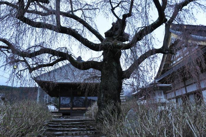400年ほどの歴史を重ねる古寺には、申し合わせた様に、枝垂桜が有り、古木の一本桜が夕闇の空に聳えていました。 |