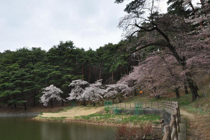 池のほとりの斜面に、樹齢100年程の古木の一本桜が満開を誇っていました。