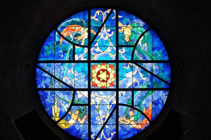 澤田政廣(さわだせいこう)は、工芸用の吹き板ガラスをフランス・ドイツから取寄せ、1850枚にカットし、一枚一枚専用の絵の具で描き、約850℃の電気炉で色を焼き付けたそうだ。