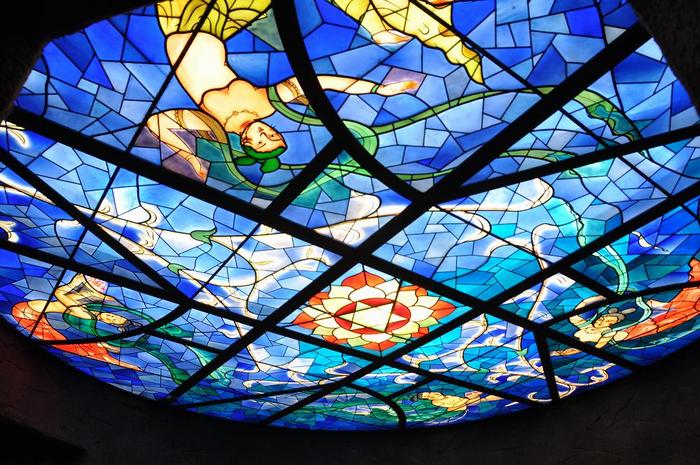 直径5メートルの絵付けステンドグラスは14ヶ月の歳月を掛けているそうだ。ところで、このステンドグラスの下で手をつないだ二人は、天空に舞う四人の天女に祝福されていつまでも幸せになれると言われています。