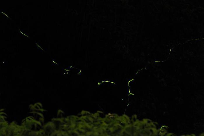 もっとも奥地の「湿原と水田」の里山の雰囲気を残す奥行50メートル、幅10メートルのエリアに、ピーク時間は多少遅れたものの、30頭ほどが木立の下の暗闇で乱舞を繰り広げていた。