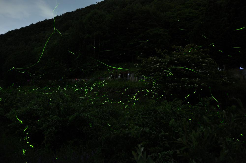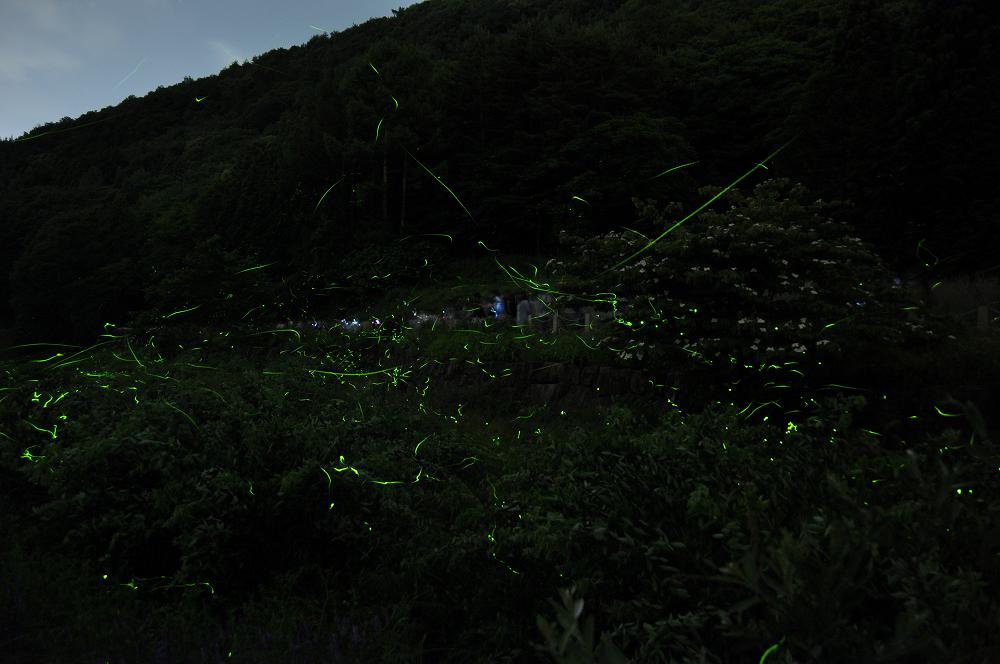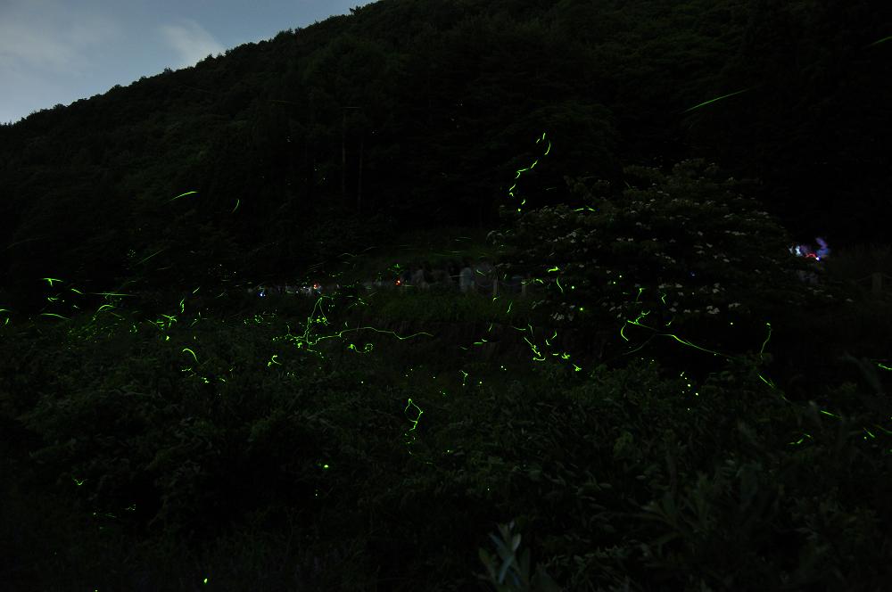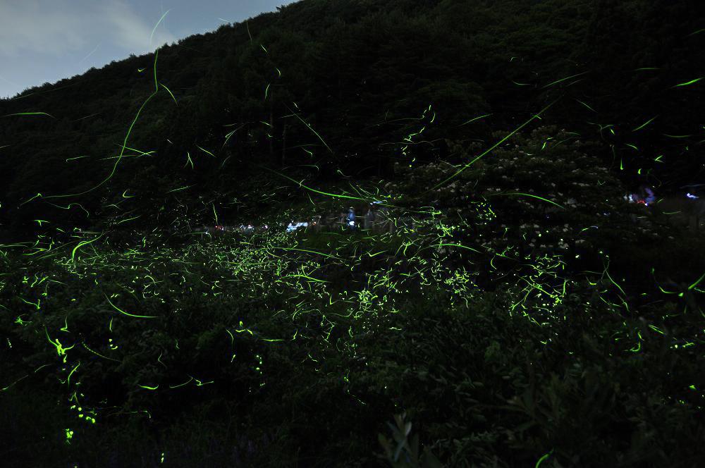 絞り値:f/3.5 ISO:640 50〜30メートル前方のホタルの光にピントをあわせる |