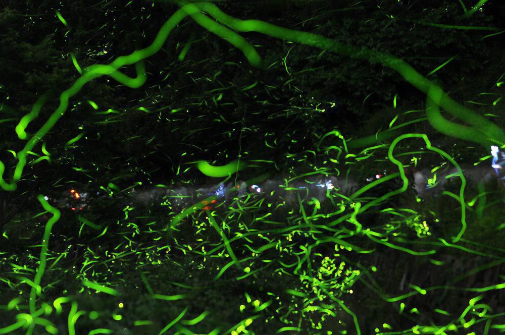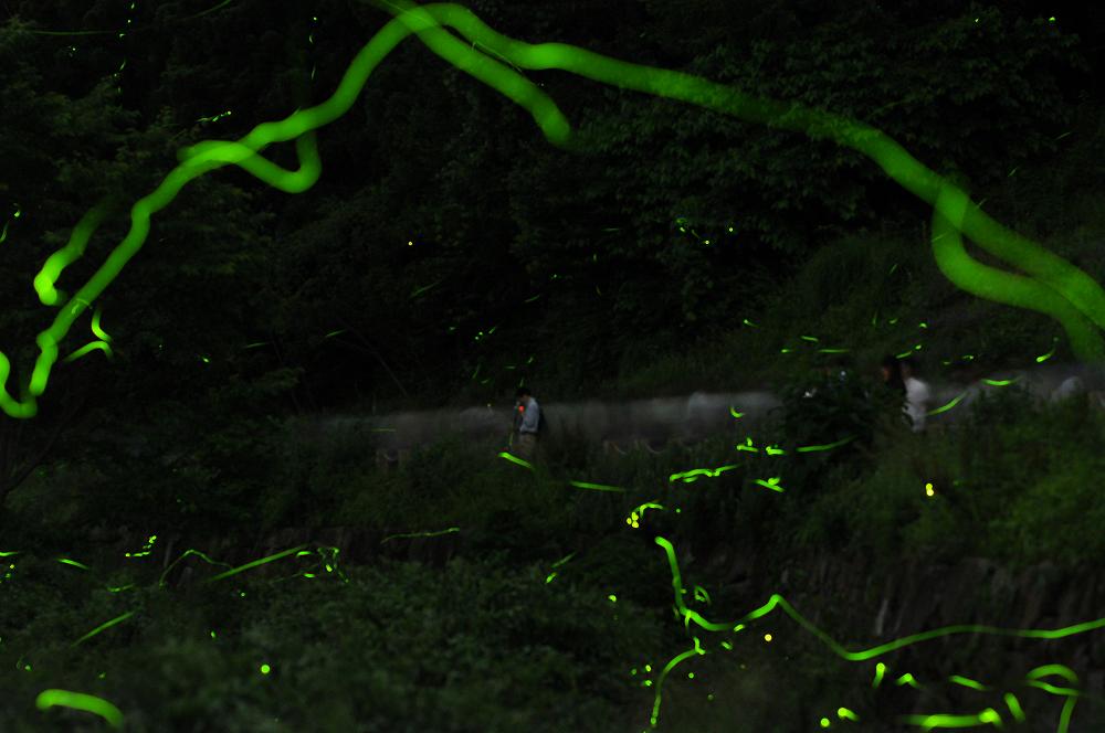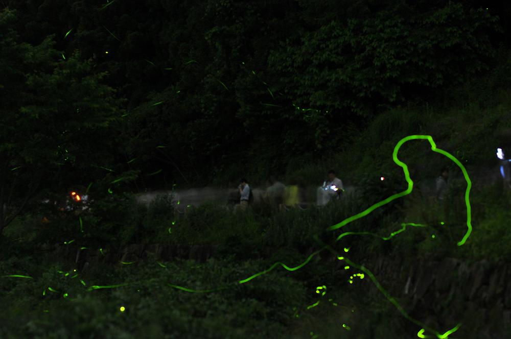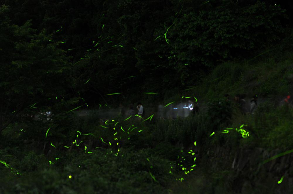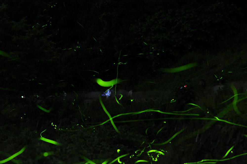 絞り値:f/2.2 ISO:640 前方の山肌の70メートル先のホタルの光にピントをあわせる |