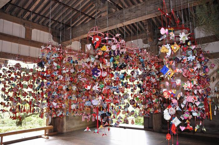 この本堂を会場として、「グランドマザー百人展・五節句の戯れ」と題して、「吊るし雛や五節句の飾り物」が展示されている。主催は、「ちりめん細工ひなたぼっこ紅絹の会よこはま」、大竹仲子さんを先生として、100人を越える生徒の60〜80歳代のおばあちゃん達が、五節句にちなんだ作品を創り、先生の発案で、デパートや文化センターなとで展示するよりは、古代・中国から伝わり、平安時代に根付いた節句の行事に関する飾り物を、室町時代の密教寺院の旧燈明寺本堂で飾って見たい・・・と、三渓園にかけあったそうだ。