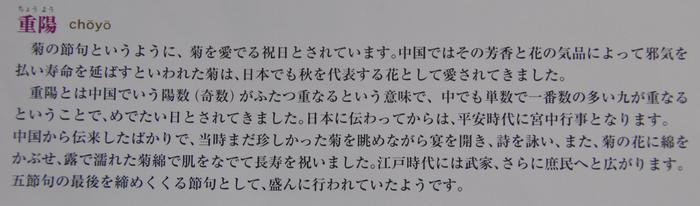 貴族たちは宴をひらいて菊酒を飲み、綿を菊に被せて露で濡れた被綿(きせわた)で体を撫でて長寿を願ったとか。江戸時代には五節句の中でも最も重要な節句として城中行事になり、最も多い陽の数字に、「幕府よ永遠なれ」と期待を寄せていたらしい。