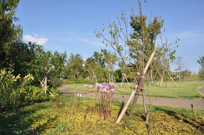 早春を彩るピンクの「ハナモモ」が咲く小道を行くと、「ムクゲ」、向かい側に「バラ」、さらに進むと「クレマチス」、その先に両サイドに「サルスベリ」と「モミジ」、さらに外周には「サクラ」が植えられ、サクラの途切れたところには「マグノリア(モクレン)」……と、ゾーン全体が、季節の移ろいと共に咲き進むように設計されています。