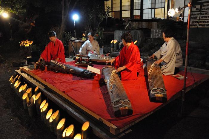 下の写真の左端の赤い着物姿の人が、この会の西原理事長です。古民家の前庭に、木造の舞台を造り、赤い毛氈を敷き、舞台の前面には、裏山から切り出した孟宗竹(もうそうだけ)を斜め切りして、中にローソクを入れ、爪で弾かれる琴の糸からは、童謡や、演歌や、民謡までが流れてます。