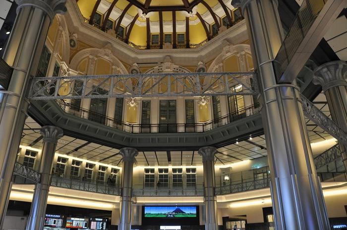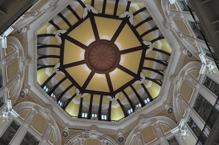 | 昭和20年の東京大空襲で焼け落ちた「丸の内北口」および「丸の内南口」のドーム天井を、100年前の姿に復元しようと、涙ぐましい努力の結果は、戦前の記録写真はモノクロの為、建設当時の色合いを出すのに苦労したとか。 8角形のそれぞれの角には、羽を広げた鷲(大きさは2.1メートル)、羽を広げた鳳凰、十二支の上の彫刻(アーチ上部のキーストーンの装飾)には、秀吉の兜のうち最も有名な「馬藺後立兜(ばりんうしろだてかぶと)」や、伊勢神宮の三種の神器の剣が飾られている。