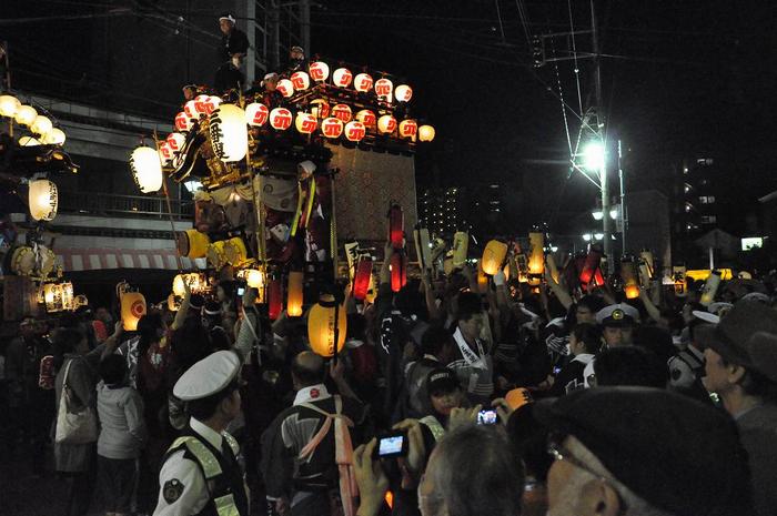 『曳っかわせ』で面白いのは、山車の5人囃子や舞い手の競演の他に、提灯を持った囃子方の行動です。