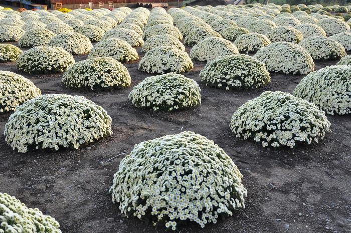 約200坪の裏庭に、ざるを伏せたようなドーム型の菊が整然と並ぶ様は圧巻であり、花の色が変化していくのが特徴で、11月20日過ぎ頃まで楽しめるそうです。