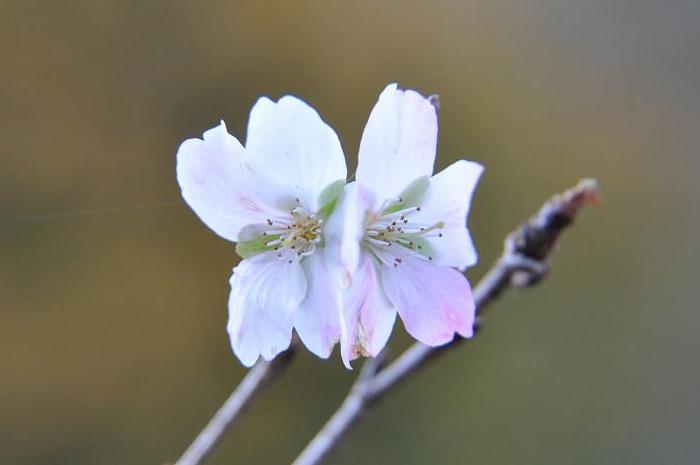 マメザクラ×エドヒガンの種間雑種と考えられ、花は一重の白又は淡紅色です。
