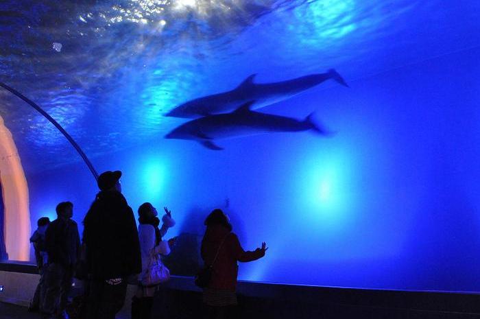 アーチ状の水槽では、バンドウイルカが夜の海をゆったりと泳いでおり、幻想的な世界でした。