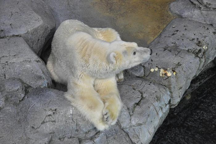 昼間は見物客の為に、水中で泳いだり、岩山に登って愛嬌を振りまいていたホッキョクグマでしたが、夜はやっぱり眠いですよね。