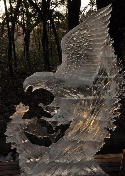 私が訪れたのは、日の出からすでに10時間ほど経過している為、わずかに射し込む木漏れ日で、幾分融け始めてはいたが、素晴らしい作品で目の保養になりました。 朝早く出掛ける事が可能ならば、午前中の早い時間に見学すると、写真よりもっと先端の尖った彫刻作品に出会うことが出来るでしょう。