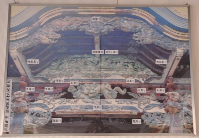 平成15年から8年間の歳月をかけ、江戸中期の色彩豊な彫刻物に蘇った。拝殿の彫刻物は、阿吽(口を開けたものと、口を閉じたもの)の組み合わせをしているのが特徴で、代表的な獅子頭があります。